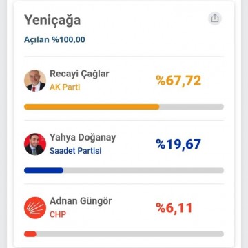 Yeniçağa ilçesinde belediye başkanlığını kesin olmayan sonuçlara göre, AK Parti adayı Recayi Çağlar kazandı. İlçede görev yaptığı 5 yıl boyunca yorulmadan hizmet ettiğini belirten Çağlar, "Görevde olduğum 5 yıl boyunca Yeniçağa halkına hizmet ettik. Herkese yakın davrandım, kibre kapılmadım. Yüzde 67,5 oyla beni ödüllendirdiler. Halkıma minnettarım. Hizmetlerin en iyilerine layık onlar." diye konuştu.