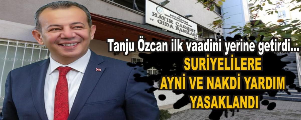 31 Mart Mahalli ve Yerel seçimleri sonrası göreve başlayan Bolu Belediye Başkanı Tanju Özcan, seçim vaatlerinden biri olan Suriyelilerle ilgili olarak ilk adımını attı. Tanju Özcan verdiği talimat ile Aşevi’nden Suriyelilere ayni ve nakdi yardım yapılmasını yasakladı. Özcan ayrıca, Suriyelilere Bolu’da iş yeri açma ruhsatı da vermeyeceğini söylemişti.