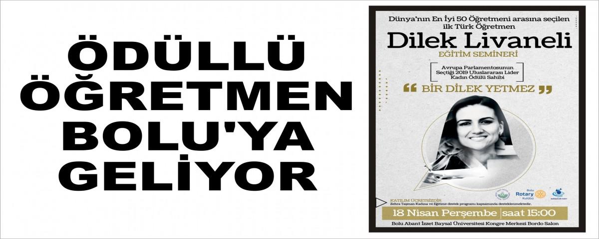 Bolu Bağışçılar Vakfı’nın hibe desteği, Bolu Abant İzzet Baysal Üniversitesi Eğitim Fakültesi ve Bolu Rotary Kulübü’nün koordinasyonu ile, ‘Bir Dilek Yetmez’ adlı eğitim seminerini 18 Nisan Perşembe günü saat 15.00’te, BAİBÜ Bordo Salon’da gerçekleştirilecek. Eğitim seminerine konuşmacı olarak Dünyanın en iyi 50 öğretmeni arasına seçilen ilk Türk öğretmen ve Avrupa Parlamentosu’nun seçtiği 2019 Uluslararası Lider Kadın Ödülü sahibi Dilek Livaneli katılacak. Bolu Abant İzzet Baysal Üniversitesi öğrencileri ve Bolu halkıyla bir araya gelecek olan Dilek Livaneli, eğitim konusunda önemli konulara değinecek. Ücretsiz olarak gerçekleştirilecek seminere tüm halkımız davetlidir. Elif Erdoğan