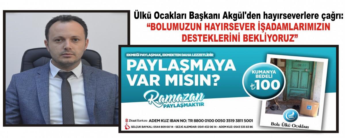 Ülkü Ocakları İl Başkanı İsmail Akgül her Ramazan Ayı olduğu gibi bu yıl da ihtiyaç sahibi ailelere dağıtılması üzere yapacakları ‘Bir Kapıya Bir Kumanya’ etkinliği için “Bolumuzun hayırsever işadamlarımızın desteklerini bekliyoruz” dedi.
