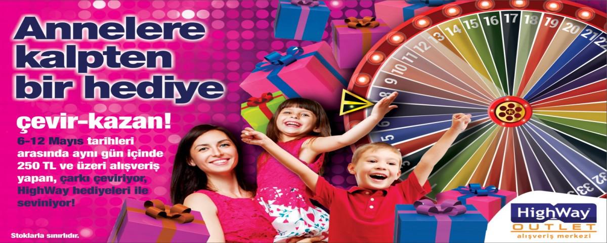 6 Mayıs-12 Mayıs tarihleri arasında düzenlenecek olan Anneler Günü kampanyasında, Highway Outlet’ten aynı gün içerisinde 250 TL ve üzeri alışveriş yapan müşteriler alışveriş fiş veya faturaları AVM Danışma noktasında ibraz ettirdikten sonra Anneler Günü kampanyası için kurulu bulunan kampanya platformundaki hediye çarkını çevirmeye hak kazanacaklar. Hediye çarkının denk geldiği numaralarda ev tekstilinden ev dekorasyonuna, giyimden aksesuara, yemekten eğlenceye, kozmetikten züccaciye ürünlerine yüzlerce sürpriz hediye Highway Outlet müşterilerini bekliyor olacak.