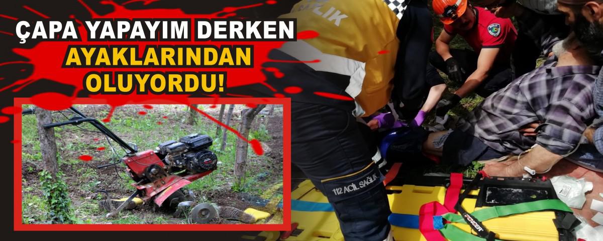Edinilen bilgiye göre, olay saat 11.00 sıralarında Borazanlar Mahallesi Dumlupınar Sokak'ta meydana geldi. Şerafettin Yıldırım bahçesini ekmek için çapa yaptığı sırada 2 ayağını da makineye kaptırdı. Durumu fark eden komşuları 112 Acil ekiplerine haber verdi. Evin bahçesine gelen sağlık ekipleri Yıldırım'a müdahale etti. İtfaiye ekipleri de Yıldırım'ın ayaklarına saplanan çapa makinesini çıkardı. 2 ayağında da kırık ve kesikler olan Yıldırım, ambulansla İzzet Baysal Devlet Hastanesi Köroğlu Ünitesi'ne kaldırılarak tedaviye alındı.