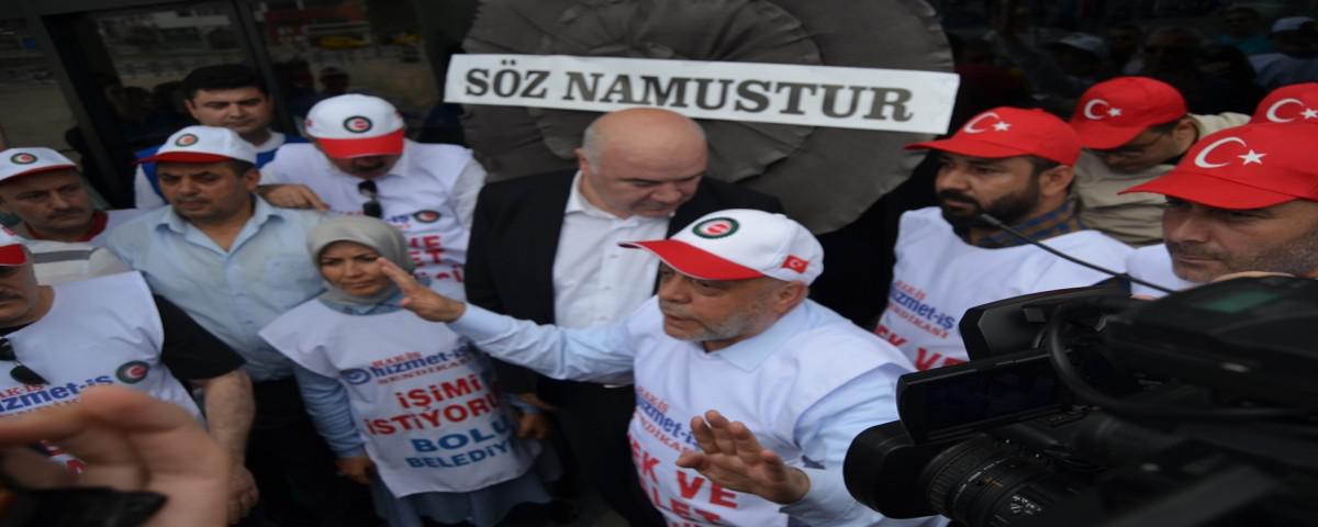 Yürüyüş öncesi Bolu Belediye Binası önünde toplanan kalabalığa seslenen Hak-İş Genel Başkanı Mahmut Arslan, Bolu Belediye Başkanı Tanju Özcan’a sert sözlerle yüklendi. Başkan Özcan’a ‘Milleti kandırdınız’ diyen Arslan, “İşten çıkarılan yaklaşık 700 arkadaşımız adına sembolik olarak devam eden bu çadırımız birilerine mesaj vermeye çalışıyor. Bir taraftan Hak-İş Sendikası ve bağlı olan sendikalarına üye olup sürgünlerle, baskılarla istifa ettirilen arkadaşlarımız, her gün sayıları artarken bir taraftan seçim meydanlarında noterden taahhütname yayınlayıp biz hiçbir işçimizi işten çıkarmayacağız diyen Bolu Belediye Başkanı, Kuran-ı Kerim’i öperek mesaj veren Bolu Belediye Başkanına sesleniyorum. Bu noter taahhüdü nerede kaldı. Milleti kandırdınız. Üyelerimizi kandırdınız, işçilerimizi, halkı kandırdınız ama Rabbimi kandıramadınız. Bunun hesabını vereceksiniz” dedi.