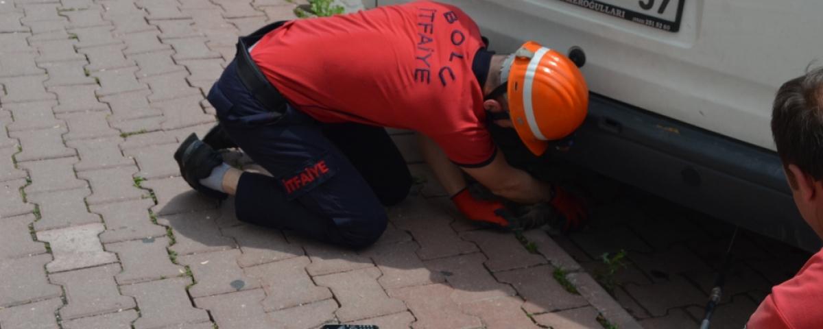 Olay yerine gelen Bolu Belediyesi’ne bağlı İtfaiye Müdürlüğü ekipleri kedinin, aracın egzoz bölümüne sıkıştığını fark edip çalışmalara başladı. Aracın altına mama koyup daha sonra da internetten kedi sesi açarak kediyi dışarı çıkartmaya çalışan itfaiye ekipleri karşılık alamadı. Daha sonra kedinin yerinin tam tespit edilmesi üzerine hayvan kurtarma aparatı ile kedi bulunduğu yerden çıkarıldı.