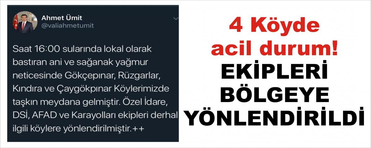 Bolu Valisi Ahmet Ümit ise sosyal medya hesabından paylaştığı gönderide 4 köyde su taşkınları yaşandığını ve ekiplerin bölgeye gittiğini söyledi. Vali Ümit paylaşımında, “Saat 16.00 sularında lokal olarak bastıran ani ve sağanak yağmur neticesinde Gökçepınar, Rüzgarlar, Kındıra ve Çaygökpınar Köylerimizde taşkın meydana gelmiştir. Özel İdare, DSİ, AFAD ve Karayolları ekipleri derhal ilgili köylere yönlendirilmiştir” ifadelerini kullandı.