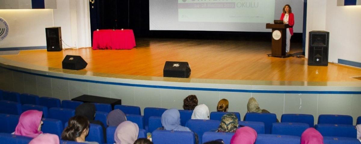 İlk günkü eğitim, BAİBÜ İlahiyat Fakültesi’nden Dr. Öğr. Üyesi Halide Nur Özüdoğru Erdoğan’ın “Aile İçi İletişim” sunumuyla tamamlandı. Dr. Öğr. Üyesi Erdoğan, aile içinde doğru ve kaliteli iletişim kavramı hakkında bilgiler vererek, “İyi bir iletişim için neler yapılmalı? Örneğin aile üyeleri birbirlerine yeteri kadar zaman ayırmalı. Türk anneleri fazlasıyla fedakâr olduğu için kendimizi önemsemeyerek çocuklarımıza ve eşlerimize kendimizi adarız. Bunun yerine özellikle eşlerin birbirleriyle özel vakitler geçirmeleri örneğin haftada birkaç kez sinemaya gidebilmeleri, hafta sonları piknik yapabilmeleri, ayda birkaç kez dışarı çıkabilmeleri veya sohbet vakitleri oluşturabilmeleri. İyi bir iletişim için sevginin açık bir şekilde dile getirilmesi lazım. ‘Ben seni seviyorum zaten, söylememe gerek var mı?’ cümlesini hepimiz duyuyoruz. Evet var, kişinin bu sevgi cümlesini duymaya ihtiyacı var. Aile üyeleri arasında özellikle sevgi bağlarının bulunması yeterli değildir, sevginin birbirlerine çok açık şekilde belli edilmesi, seni seviyorum cümlesinin söylenmesi lazım. Yetiştirilme tarzlarımızdan dolayı zorlanabiliriz bunu yaparken ama hem çocuklarımıza hem eşimize onları ne kadar çok sevdiğimizi söylemeliyiz. Onları da size karşı sevgilerini göstermeleri için teşvik etmeliyiz.” diye konuştu.