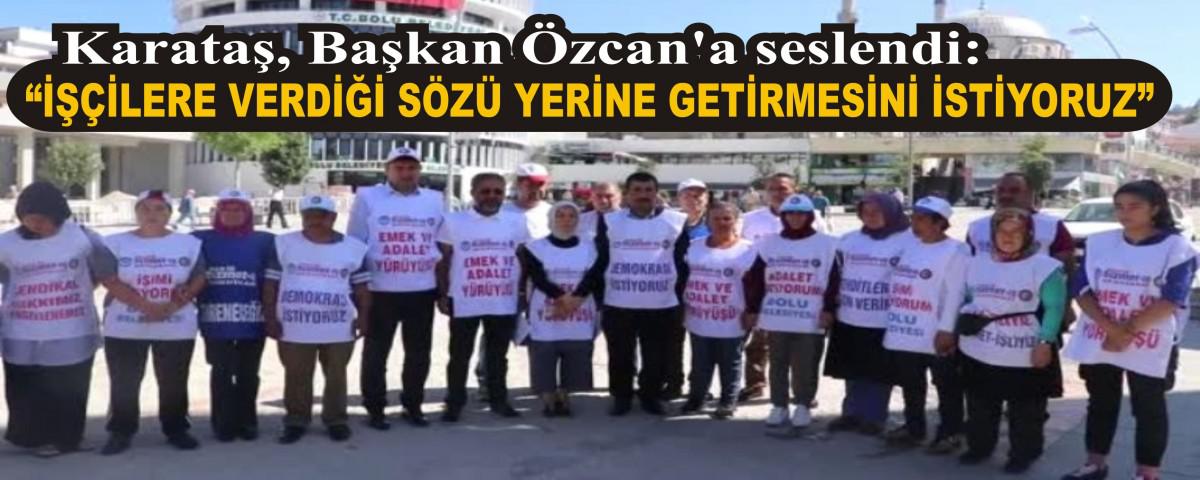 Karataş, "Sayın Özcan size inananların güvenlerini yıkmayın. Size oy verenleri mahcup ve pişman etmeyin." dedi. Karataş, emekçinin alın teri ve akıl terinin kutsal olduğunu anlatarak, yanlıştan dönmek için hiçbir vaktin geç olmadığını bildirdi. CHP Genel Başkanı Kemal Kılıçdaroğlu'nun 31 Mart yerel seçimlerinden önce seçmenlere TBMM kürsüsünden verdiği sözü yerine getirmesini istediklerini belirten Karataş, şöyle konuştu: "İşçilere kendilerinin kazandığı belediyelerde bir sorun yaşarsanız, bir sıkıntınız olursa bana gelin beni bulun diyerek namus sözü verdi. Kılıçdaroğlu çağırdı biz de Ankara'ya kadar 196 kilometre gittik ancak kapı duvar oldu. Biz geldik, işimizi, aşımızı, ekmeğimizi istedik sizi bulamadık. Lütfen sözünüzün arkasında durun. Bolu'daki sendikal mücadelemiz ilk günkü kararlılıkla devam etmektedir. Arkadaşlarımız işbaşı yapana kadar mücadeleye devam edeceğiz."