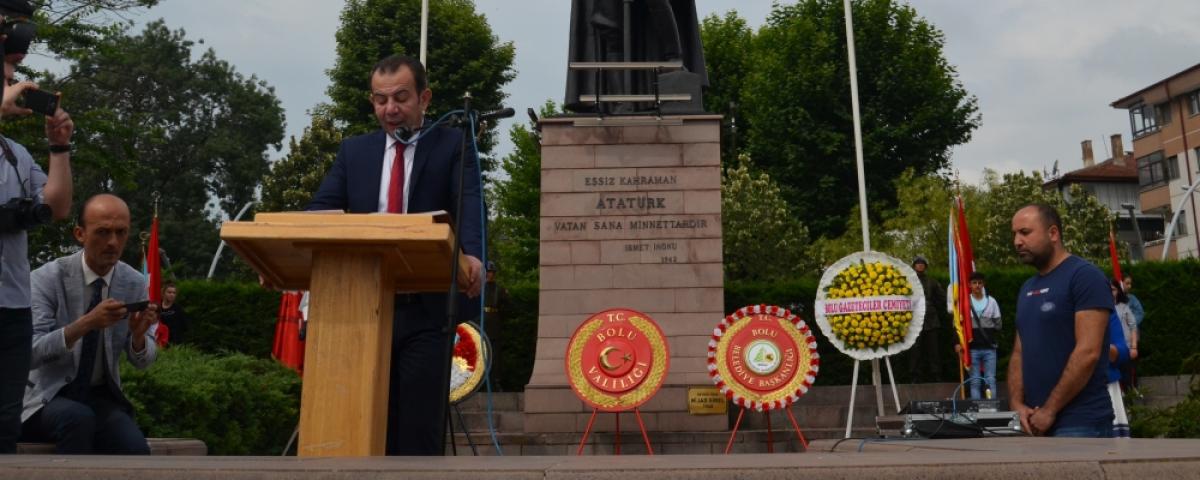 Çelenk sunumunun ardından anıt özel defterini okumak ve imzalamak için kürsüye gelen Bolu Belediye Başkanı Tanju Özcan, 85 yıl öncesinin heyecanını bir kez daha bayram havasında yaşadıklarını ifade ederek, “Kurtuluş Savaşımızın değerli Başkomutanı, çağdaş cumhuriyetimizin kurucusu, eşsiz kahraman Gazi Mustafa Kemal Atatürk, ilimiz gelmenizin 85’inci yıldönümünü kutladığımız bugün Bolulular olarak sizi sevgi, saygı ve minnetle anıyor, 85 yıl öncesinin heyecanını bir kez daha bayram havasında yaşıyoruz. 1919 yılın Kuvayı Milliye ruhu ile başlatmış olduğunuz milli mücadele ile bu toprakları bizlere tekrar vatan kıldınız. Tam 85 yıl önce ayak bastığınız bu toprakları yine aynı ruh ve bilinçle 21’inci yüzyılda fikri hür, vicdanı hür nesiller olarak akıl ve bilimle bu güzel yurdu en güzel şehirlerimizden biri olan Bolu’ya gösterdiğiniz hedefler doğrultusunda milli unsurlardan asla taviz vermeden hizmet edeceğime huzurlarınızda söz veriyorum. Yüreği vatan, millet ve sizin sevginiz ile dolu olan Bolumuzun Belediye Başkanı olarak sizleri ve ebediyete intikal etmiş tüm silah arkadaşlarınızı bir kez daha saygı ile anıyor, şükranlarımı sunuyorum. Ruhunuz şad olsun” ifadelerini kullandı.