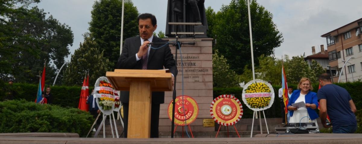 Başkan Özcan’ın ardından anıt defterini okumak ve imzalama adına kürsüye gelen Bolu Valisi Ahmet Ümit ise, “Türkiye Cumhuriyeti’nin kurucu Gazi Mustafa Kemal Atatürk, Türkiye Cumhuriyeti’nin ilk Cumhurbaşkanı sıfatı ile güzel Bolumuza teşriflerinizin 85’inci yıldönümünde 17 Temmuz tarihinin ilimize kattığı anlamı, halkımızın yüreğinde oluşturduğu coşku ile kutlamanın onuru içerisinde sizi bir kez daha saygı ile selamlıyoruz. 85 yıl önce onurlandırdığınız ve güzelliklerinden mütehassis olduğunuz Bolu günden güne gelişmekte ve kalkınma yolunda büyük mesafeler almaktadır. Bolu halkı size layık olmaya çalışmanın gururunu da içselleştirerek büyük bir azim ve kararlılıkla yoluna devam etmektedir. Türkiye Cumhuriyeti’nin muhasır medeniyetler seviyesinin üzerine çıkarma görevinin bilincinde, bu yüce milletin fertleri olarak birlik ve beraberlik içerisinde emanetini layığı ile yaşatmak için çalışıyoruz ve çalışacağız. Cumhuriyetimizin kuruluşunun yüzüncü yılında ülkemizi, dünyanın en güçlü ülkelerinden biri haline getirmek için kültürümüze, medeniyetimize ve tarihimizin güzelliklerine, bizleri biz yapan manevi değerlere sahip çıkarak göstermiş olduğunuz yolda ilerliyoruz ve ilerleyeceğiz. Bu anlamlı gün vesilesi ile sizi, milletimizin ve devletimizin bağımsızlığı için kutsal vatan uğrunda canlarını seve seve feda eden aziz şehitlerimizi ve kahraman gazilerimizi bir kez daha selamlıyor ve anıyoruz. Ruhun şad olsun” şeklinde konuştu.