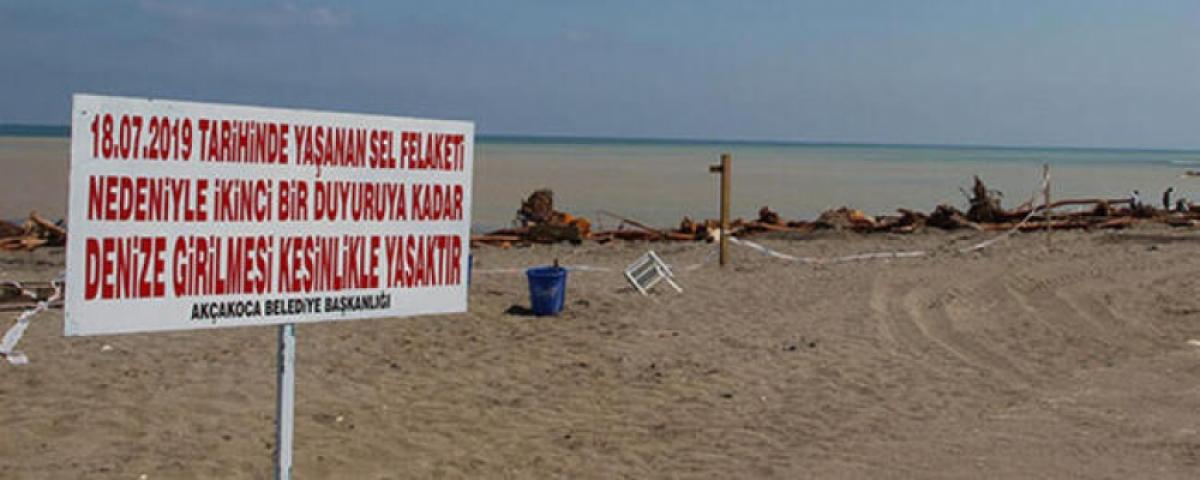 Akçakoca Belediye Başkanlığı tarafından sahillere asılan tabelalar da “18 Temmuz 2019 tarihinde yaşanan sel felaketi nedeniyle ikinci bir duruya kadar denize girmek kesinlikle yasaktır” tabelası asıldı.