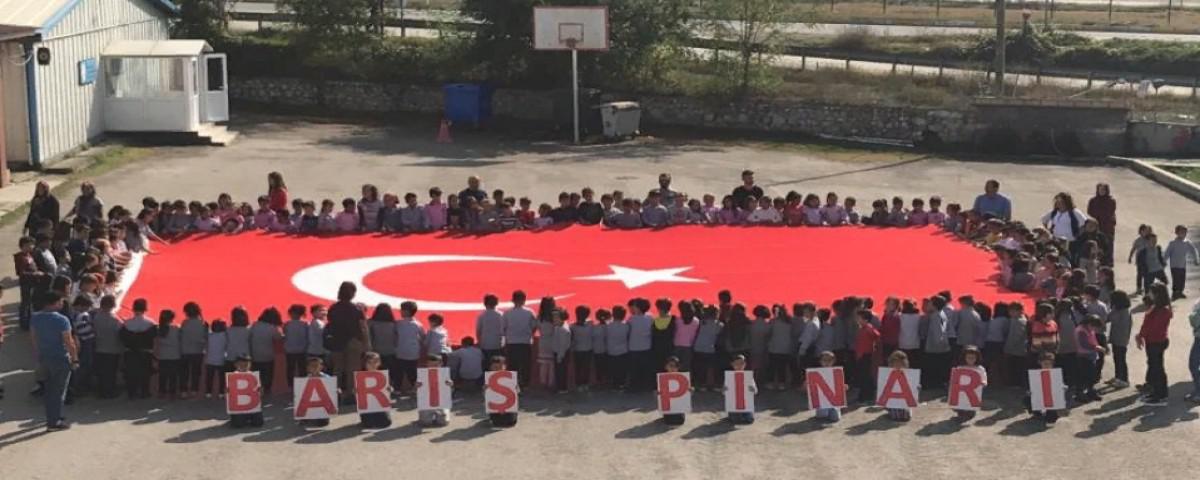 Çaydurt Jandarma Komutanının da katıldığı etkinlikte, okul bahçesinde dev Türk Bayrağı açan Bolu Çaydurt İlkokulu öğretmen ve öğrencileri ''En Büyük Asker Bizim Asker'', ''Barış Pınarı '' tezahüratları altında Türk Bayrağını çılgınca dalgalandırdılar.