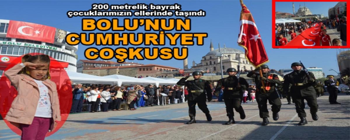 Ödül töreni ve gösterilerin sana ermesinin ardından tören yürüyüşüne geçildi. Bolu’daki lise, ortaokul ve ilkokul öğrencileri sıra ile tören alanından yürüyüşe geçerek, protokol üyelerinin bayramını kutladı. Minik öğrenciler ise ellerin 200 metrelik Türk Bayrağı ile alandan geçiş yaptı.
