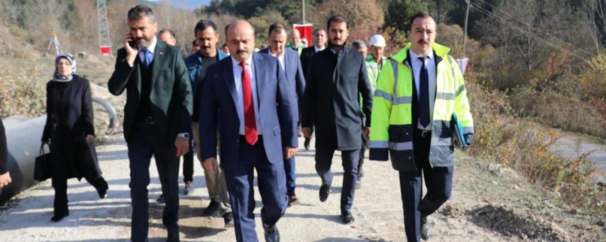 Yaptığı incelemelerin ardından basın mensuplarına açıklamalarda bulunan Bakan Yardımcısı Fatih Metin, “Bu gün geleceğe nefes programı çerçevesinde Bolu’dayım. Tabi ki Bolu’ya her geldiğinde şahsımın sorumluluğu olan Tarım ve Orman Bakanlığı hizmetlerimiz ziyaret ediyoruz. Bizim için çok önemli proje olan Ak Partinin Bolu merkezi açısından büyük ihtiyaç olarak gördüğü içme suyumuzu da inşaat alanında devamlı her geldiğimde inceliyor gerekli bilgileri alarak talimatları veriyorum. Bu günde il başkanımız, ilçe başkanımız ve kadın kolları başkanımızla beraber bu hizmetimizin aldığı mesafeyi incelemeye geldik. Şu an bu tünel kaynaktan buraya 3,6 km’lik bir tünel. Bunun içinden içme suyu tesisatı yapılacak ve ardından yine bizim inşaatına devam ettiğimiz boru tesisatına bağlanacak. Şu anda 3.6 Km’lik tünelin belediye tarafından beton kaplamasının yapılmasını bekliyoruz. Allaha çok şükür ben bakan yardımcısı olduktan sonra buradaki işin yürümesi anlamında 2019 yılının son 6 ayı itibariyle 5 buçuk milyon bir ödeneği tahsis ettik ve müteahhitimiz hızlıca çalışmasına başladı. Bu kapsamda da 3 km’lik tesisatımızı yapımı devam ediyor. Tabi bu hattı şöyle tarif etmek gerekir 12.6km’lik hattın 3.6 Km’si bu tünel. Yine bu hat üzerinde 1,9 Km’lik bir hatta kamulaştırma işlemi yapılması lazım. Oda belediyemizin yapması gereken iş. Bizde 12,6 Km’lik hatta içme suyu tesisatımızın işlemini yapmış olacağız. Biz hizmetlerimi Allaha şükür devam ediyoruz. Ben buradan DSİ müdürümüz ve çalışma arkadaşlarıma teşekkür ediyorum. Gece gündüz demeden Bolumuzun her türlü birçok alanında mücadele ortaya koyuyorlar. Allah’ın izniyle Bolumuz 17 yıldır olduğu gibi her alanda hizmet almaya devam edecek. Vatandaşımızın bize verdiği emaneti en iyi şekilde partimizle birlikte çalışıyoruz. İnşallah şu an bolumuzun içme suyu hayali olan tesisatını neticeye vardıracağız onun için buradayız. İnşallah belediyemizin de üstüne düşen bu iki işlemi yapmasıyla beraber bir an önce bolumuzun içme suyuna kavuşmasını sağlayacağız. Belediyemizle hızlı bir şekilde bu işi yaparsak bolumuz suyuna kavuşacak. Belediyemizin bunları yapması için DSİ’yi beklemelerine gerek yok. Zaten DSİ çalışıyor. Dediğim gibi içme suyu hattı ile ilgili çalışmalarımız devam ediyor” diye konuştu.