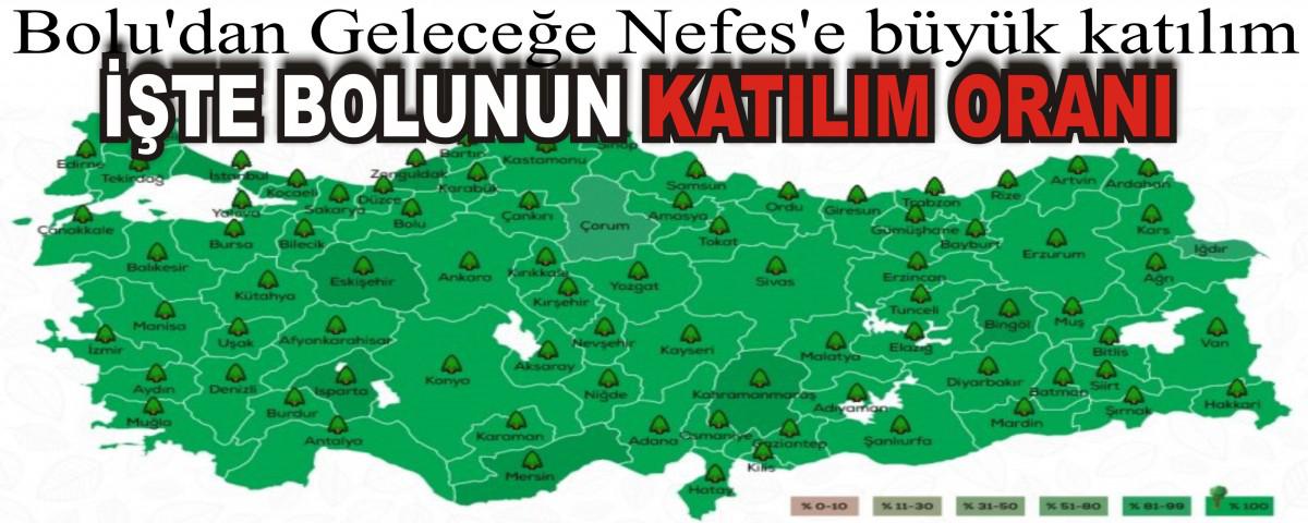 11 milyon fidan dikilmesi amacıyla başlatılan Geleceğe Nefes Kampanyasında 13 milyondan fazla fidan sahiplenildi. Tarım ve Orman Bakanlığı'nın fidan dikmek için başlattığı ve fidan dikme bayramı ilan ettiği projeye katılım gösteren il yüzde 171 fidan sahiplenmeyle Manisa. Manisa'yı yüzde 162'yle Isparta ve Tunceli, yüzde 158'le Bingöl ve yüzde 157'yle Edirne takip ediyor. Açıklanan verilere göre Bolu da katılım durumu %111 olarak açıklandı. Verilere göre Bolu da hedeflenen fidan sayısın 108.225 sahiplenilen fidan sayısı ise 120.439 olarak açıklandı. Sefa GÜNAY