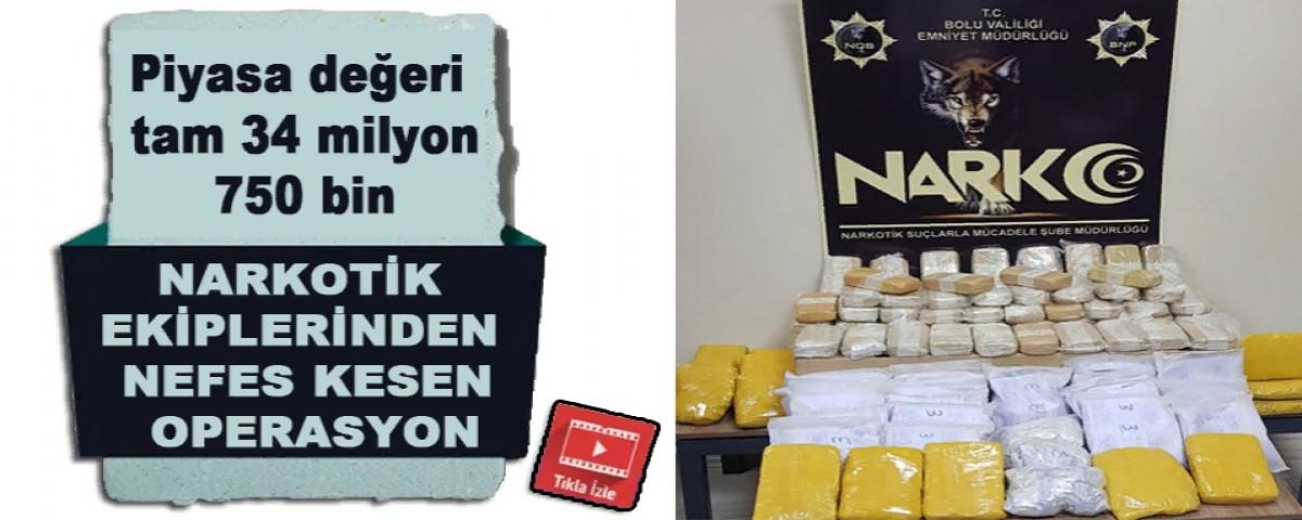 Bolu’da, Narkotik Suçlarla Mücadele Ekipleri tarafından yapılan uyuşturucu operasyonda piyasa değer 34 milyon 750 bin TL yapan 69 kilo 500 gram eroin ile yakalanan 5 kişi adliyeye sevk edildi.