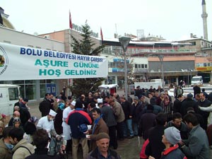 Bolu Belediye Başkanlığı Muharrem Ayı münasebetiyle halkımıza aşure dağıtacak. Bolu Belediyesi ve Hayırsever vatandaşların katkıları tarafından yaptırılan aşure dağıtımı Bolu Belediyesi önünde bugün saat 13.00 de yapılacak. Bolu Belediyesi tarafından halkımıza dağıtılacak olan aşurenin malzemeleri hayırsever vatandaşlar tarafından alınırken Bolu Belediye Başkanı Alaaddin Yılmaz yardım eden hayırsever vatandaşlara teşekkür etti.