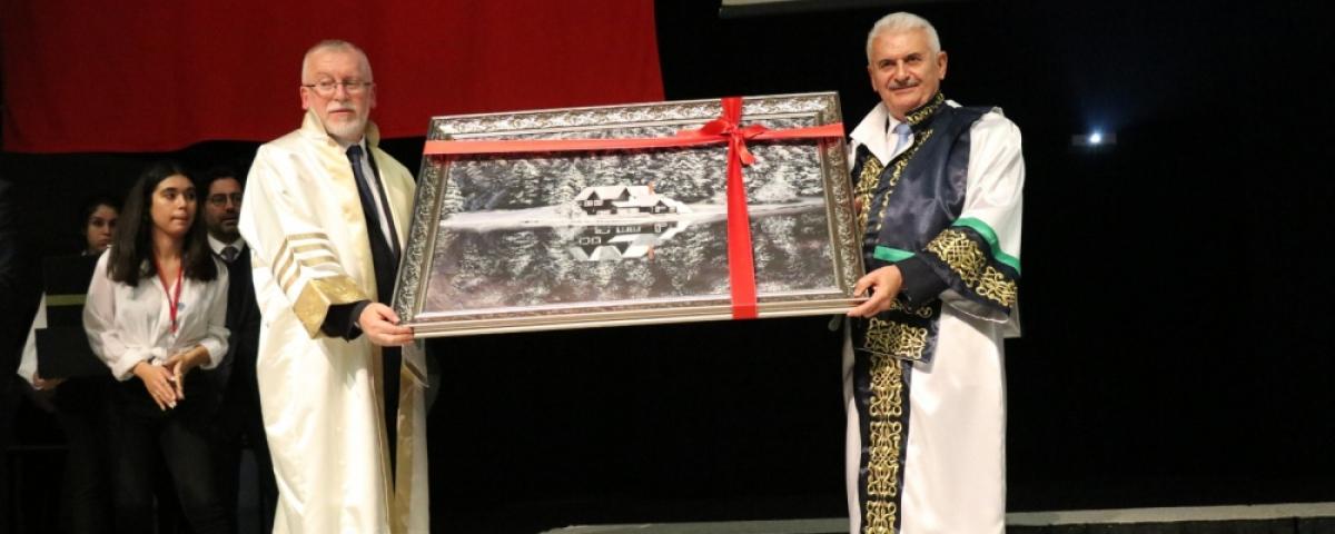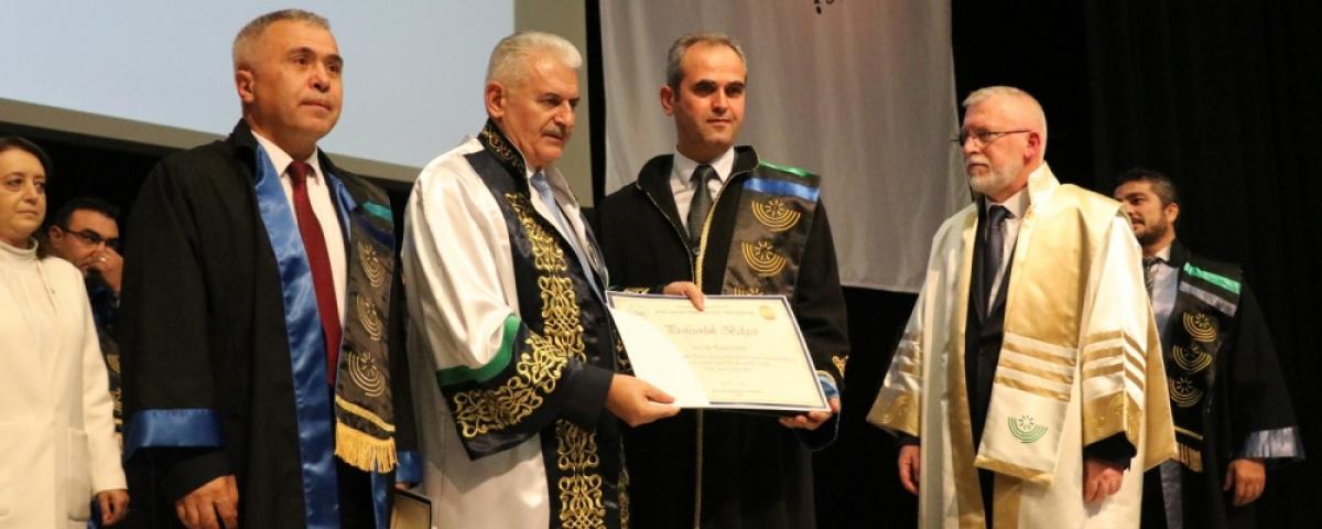 Ahmet Baysal’ın konuşmasının ardından BAİBÜ Rektörü Prof. Dr. Mustafa Alişarlı kürsüye gelerek, Binali Yıldırım’ı fahri doktora ünvanını vermek üzere kürsüye davet etti. Alkışlar eşliğinde kürsüye gelen Yıldırım’a cüppesini giydiren Alişarlı daha sonra Güzel Sanatlar Fakültesi öğrencileri tarafından yapılan Gölcük manzaralı tabloyu hediye etti. Fahri Doktoro ünvanı için konuşan Yıldırım, “Üniversitemizin müzik insanları güzel şarkılarımız, türkülerimiz, ezgilerimiz ile çok güzel örnekler sergilediler. Kendilerine teşekkür ediyorum. Değerli dostlarım, hocalarımız, öğrencilerimiz, protokolün değerli mensupları öncelikle Bolu Abant İzzet Baysal Üniversitemizin 2019 – 2020 akademik yıl açılışı dolayısı ile burada sizlerle beraber olmaktan büyük bir bahtiyarlık duyduğumu belirtmek istiyorum. Kendime verilecek olan fahri doktora için Rektörümü Prof. Dr. Mustafa Alişarlı’ya teşekkür ediyorum. Biz millet olarak tenkitte cömert, takdir de cimriyizdir. Bana bu takdirler ancak ve ancak hepiniz için daha fazlasını yapmak, güzel işlere imza atmak için vesile oluyor. Bu yüzden bu nezaketinizden dolayı sizlere teşekkür ederim” şeklinde konuştu.