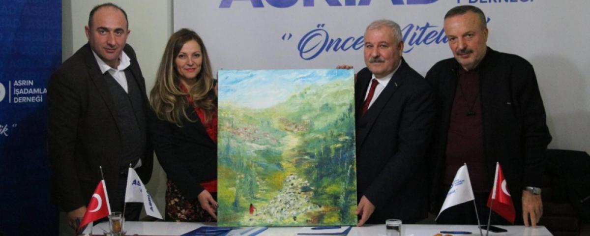 Toplantıda son olarak, Ressam Ümit Kozan tarafından ASRİAD Genel Başkanı Adnan Danışman’a Köroğlu Dağları temalı bir yağlı boya tablosu hediye edildi.