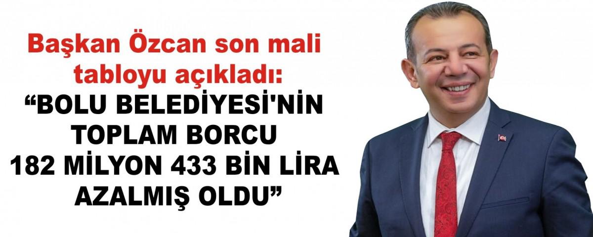 Bolu Belediye Başkanı Tanju Özcan, belediye meclisi toplantısında mali tablonun son durumu için "Bolu Belediyesi’nin toplam borcu 182 milyon 433 bin lira azalmış oldu. Aralık ayı sonunda İller Bankası’nın kesintisi, bizim piyasaya yapacağımız ek ödemelerle bu rakam 190 Milyon liraya ulaşacak” dedi.