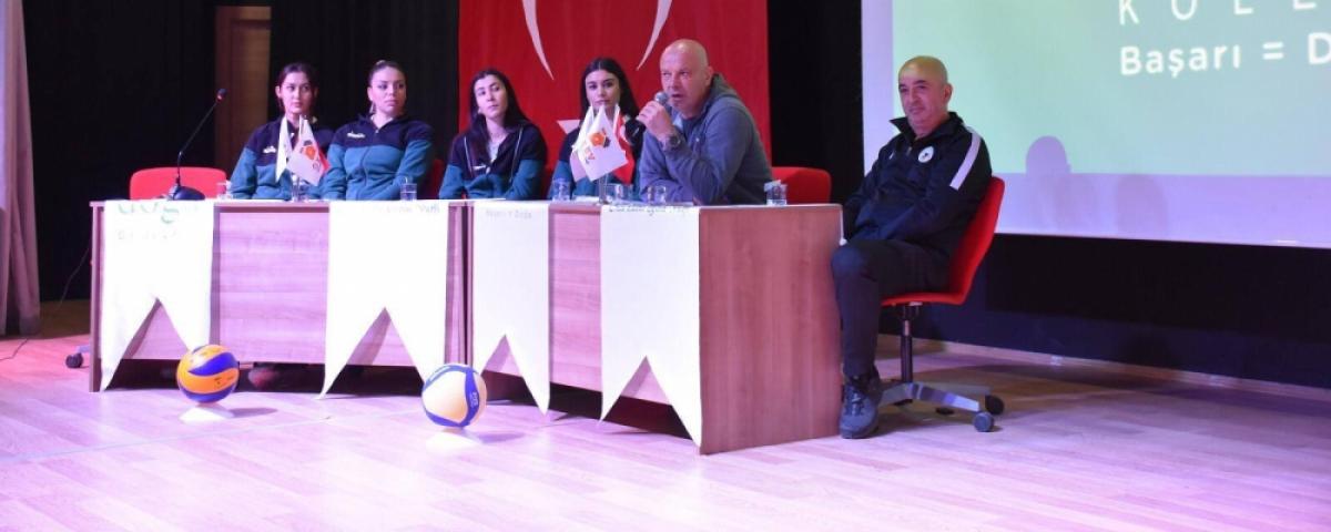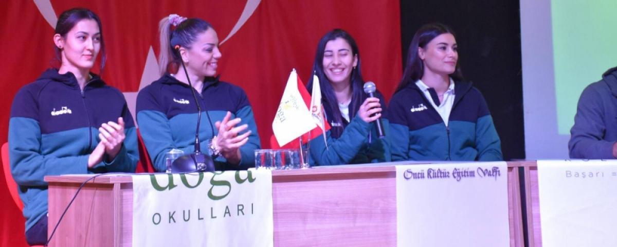 Kaliteli hizmeti ve güçlü eğitim kadrosu ile faaliyet gösteren Bolu Doğa Koleji, geçtiğimiz gün Bolu Belediyespor Yönetim Kurulu Başkanı Av. Sinan Barut, Voleybol Antrenörleri Behçet Erdoğan ve Salih Yergin, Voleybol oyuncuları Danijela Dzâkovic, Selin Toy, Şiirsel Merve Altın, Miray Akpınar Akgüney’i ağırladı. Bolu Doğa Koleji Konferans Salonunda düzenlenen söyleşide Bolu Belediyespor’un tarihçesine yer verildi. Farklı branşların da yer aldığı kulübün yönetimi, öğrencilere “ Sporu sevin, maçlarda yerinizi alın ve ilgi duyun” çağrısı yaptı. Sporcu olmak için akademik başarının da mutlaka hayatta yer alması gerektiğini belirten antrenörler ve oyuncular öğrencilerin “Spor ve beslenme, voleybol takımının ligteki başarısı nedir?, Sporcu olmaya nasıl karar verdiniz?, Türkiye’deki voleybol diğer ülkelerle karşılaştırıldığında ne düşünüyorsunuz?” gibi Türkçe ve İngilizce soruları yanıtladı.