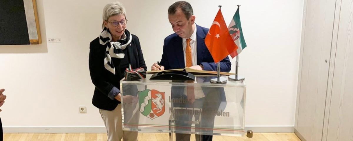 Bolu Belediye Başkanı Tanju Özcan, Almanya’da ilk olarak Türkiye Cumhuriyeti Düsseldorf Başkonsolosu Ayşegül Gökçen Karaarslan’a nezaket ziyaretinde bulundu. Konsolosluk binasındaki buluşmanın ardından Başkan Özcan, Düsseldorf Eyalet Meclisi’ne geçerek, Demokrat Parti Milletvekili ve Parlamenterler Türkiye Grubu Başkanı Carina Gödecke ile bir araya geldi.