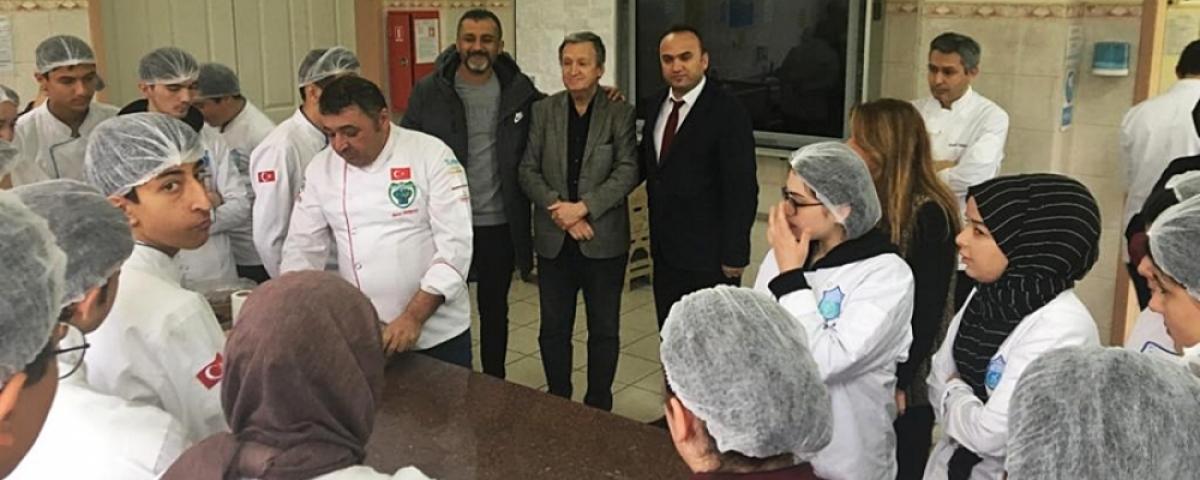 Milli Eğitim Bakanlık Maarif Müfettişi Sezai Güler ve Bolu İl Milli Eğitim Müdürü Sayın Yasin Tepe’nin de bulunduğu ‘Kariyer Günleri’ kapsamındaki programda, Master Şef Barış Dırbalı ve AİBÜ Öğretim Görevlisi Zuhal Özdemir Yaman okulun atölyelerinde 11.sınıflara ‘Hamur Yapım Teknikleri’ çalışmalarını anlatarak gösterdiler.