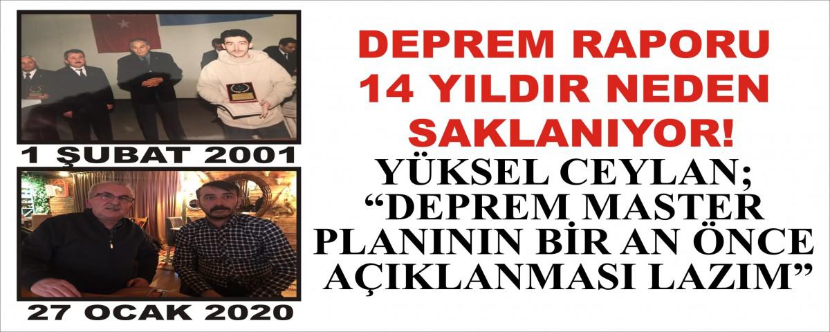 12 Kasım 1999 depremini yaşayan dönemin Bolu Belediye Başkanı Yüksel Ceylan, Boğaziçi Üniversitesi Kandilli Rasathanesi Deprem Araştırma Enstitüsü Deprem Mühendisliği Ana Bilim Dalı öğretim üyelerine yaptırılan ve 2006 yılında Bolu Belediyesi’ne teslim edilen deprem raporunu hatırlattı. 7 bin 500 konutu kapsayan raporun kamuoyuna açıklanması gerektiğini belirten Ceylan, “Bolu Belediyesi tarafından Deprem Master Planı hakkında bir açıklama yapılmadı. Master Planının Bolu Belediyesi’nde olduğunu öğrendim. Deprem Master Planının bir an önce açıklanması lazım” dedi.