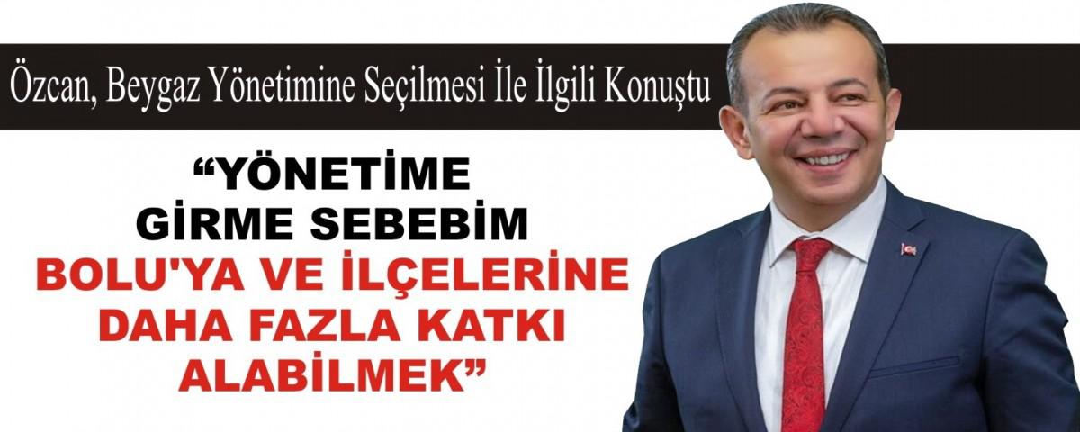 Beygaz yönetimine giren Bolu Belediye Başkanı Tanju Özcan, Beygaz yönetimine girmesi ile ilgili açıklamalarda bulundu. Beygaz yönetimine girmesinin sebebinin Bolu’ya ve ilçelere daha fazla katkı sağlamak olduğunu söylen Başkan Özcan, “Bolu’ya yapılacak yatırıma başka yerlerden Bolu’ya doğru yontabilir miyiz? diye bu görevi kabul ettik” ifadelerini kullandı.