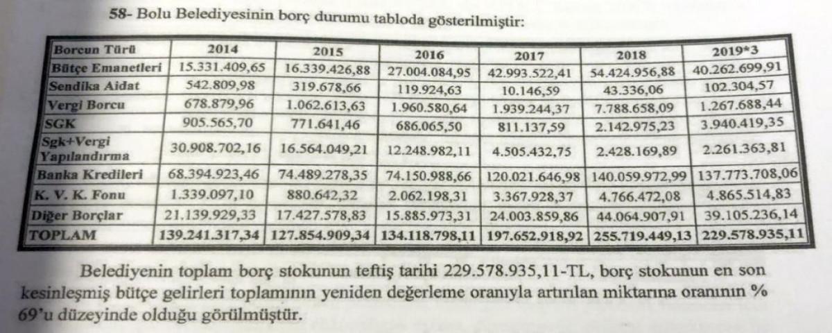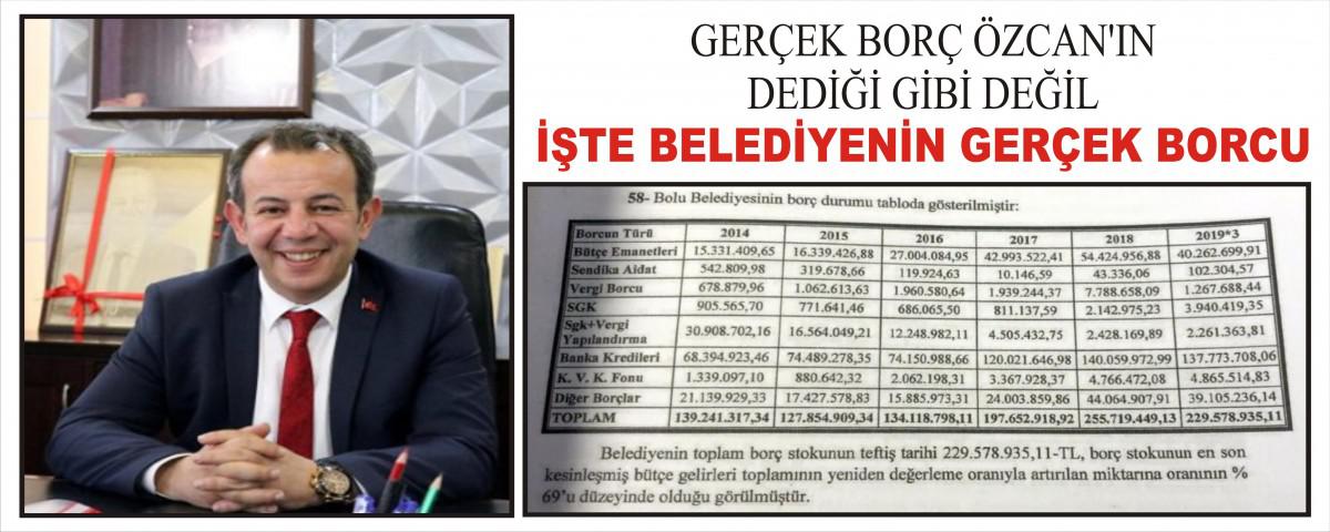 AK Parti Bolu İl Başkanı Nurettin Doğanay’da geçtiğimiz yıl Ağustos ayında borcun 210 milyon TL olduğunu açıklamıştı.31 Mart yerel seçimlerinde 15 yıldır AK Parti’li Alaaddin Yılmaz’dan başkanlık görevini alan CHP’li Özcan, Bolu Belediyesinin borçlarını kalem kalem açıkladı. Özcan, AK Parti’li Yılmaz’dan geriye kalan 461 milyon TL’lik borç yükünün ayrıntılarını tek tek kamuoyu ile paylaştı. İçişleri Bakanlığı tarafından hazırlanan raporda ise Bolu Belediyesinin borcunun Özcan’ın açıkladığı rakamın yarısı olduğu tespit edildi. İçişleri Bakanlığı Mülkiye Müfettişleri tarafından hazırlanan Bolu Belediyesi Özel Teftiş raporunda borcun 229 milyon 578 bin 935 TL olduğu ortaya çıktı.
