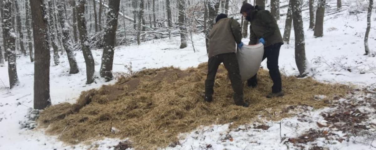 Bolu Doğa Koruma ve Milli Parklar Müdürlüğü ekipleri doğada yemleme çalışması. Ormanlık alanlarda yemleme yapan ekipler, kar yağışı boyunca da çalışmalarını sürdüreceklerini belirttiler. Bolu DKMP tarafından yapılan açıklamada, “Yaban hayatını desteklemek amacıyla Müdürlüğümüz ekiplerince yemleme çalışması yapılmıştır. Yaban hayvanlarının aç kalmaması için faaliyetlerimiz devam etmektedir” ifadelerine yer verildi.