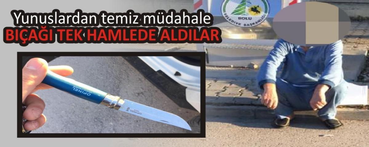 Olay sabah saat 08.30 sularında Aşağısısoku Mahallesi Cihan Sokak üzerinde meydana geldi. Vatandaşların ihbarı üzerine olay yerine sevk edilen Yunus ekipleri, psikolojik tedavi gördüğü belirtilen 52 yaşında ki Mustafa Ö.’nün elinde bıçakla sokak üzerinde gezindiğini gördü. Mustafa Ö.’ye sakin bir şekilde yanaşan Yunus ekipleri, bir yandan vatandaşla konuşurken bir yandan da en uygun şekilde müdahalede bulunabilmek amacıyla vatandaşın etrafını sardı.