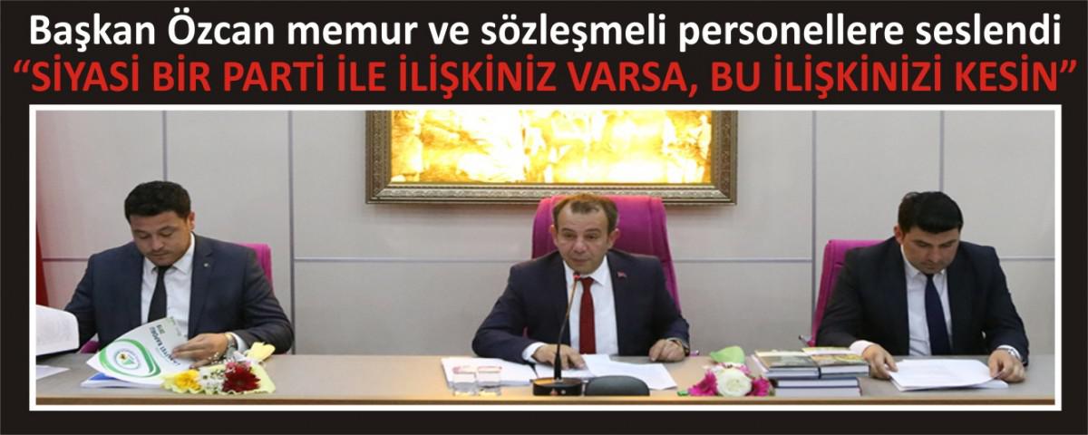 Başkan Özcan’ın sözleşmeli personel disiplin yönetmeliği ile ilgili yaptığı açıklama şu şekilde, “Sözleşmeli personellerin hiçbir siyasal partiye üye olmaması gerekiyor. Mevcut sözleşmeli personellerimizden kinlerin hangi siyasi partiye üye olduklarını araştırmış değilim. Ama gelen duyumlar bazılarının siyasal partiye üye olduğunu gösteriyor. Devlet memurları siyasal partiye üye olamaz bu gün alacağımız kararla sözleşmeli personeli de memur gibi değerlendireceğiz. İşçi arkadaşlarım ile ilgili söyleyeceğim bir şey yok. Onlarla ilgili seçim sürecinde söylemiştim. Hiç kimsenin nereye kayıtlı olduğunu araştırma imkanım var ama araştırmayacağım demiştim. Araştırmışta değilim. O yüzden sözleşmeli personelimize şunu söylüyorum. Bu karar alınır alınmaz siyasi bir parti ile ilişkiniz varsa, bu ilişkinizi kesin. Memurlarımız ve sözleşmeli personelimizi hiçbir siyasi partinin kapısından girerken görmek istemiyorum. Ne CHP’de görmek istiyorum ne İYİ Partide, ne MHP’de nede AK Partide görmek istemiyorum. Memurlarımız ve sözleşmeli personelimiz işini yapsın siyaset onların işi değil. Çay içmeye de gitmesinler memur memurluğunu yapsın. Siyaset yapmak isteyen memur varsa nasıl yapacağı açık. Ben belediye başkanı olduğum sürece bir memuru CHP’de de görsem Ak Parti’de e görsem tavrım farklı olur. Memurun işi yapacak. İşçi arkadaşlarım için bunu söyleyemem çünkü anayasal haklarıdır. Ama dediğim gibi memurların işi o değil.
