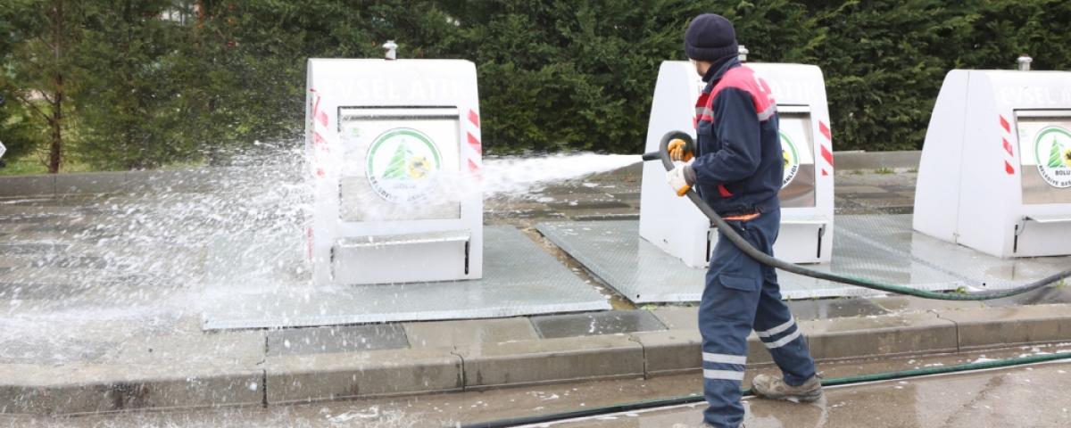 Dünyada hemen hemen her ülkeye sıçrayan ve çok sayıda ölüme yol açan Covid-19 Korona virüs tehlikesinin ülkemizde de görülmesinin ardından Bolu Belediyesi halk sağlığını sağlamak ve salgının önlenmesi için gerekli önlemleri aldı. Bu kapsamda tehlikeli virüse karşı birçok alanda düzenli olarak dezenfekte çalışmalarını sürdüren belediye ekipleri, yer altı çöp konteynerlerini de düzenli olarak dezenfekte ediyor. Ekipler ayrıca belirli aralıklarla sokaklar ve caddelerde de yıkama çalışması gerçekleştiriyor.