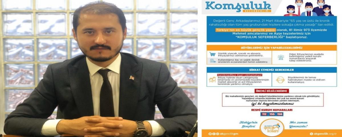 İçişleri Bakanlığımızın dün almış olduğu kararlar neticesinde 65 yaş üzeri vatandaşlarımızın sağlığı açısında sokağa çıkma yasağı getirildi. 1.2 milyonu aşkın AK Parti Gençlik teşkilatlarımıza ise büyük bir sorumluluk düşmektedir.
