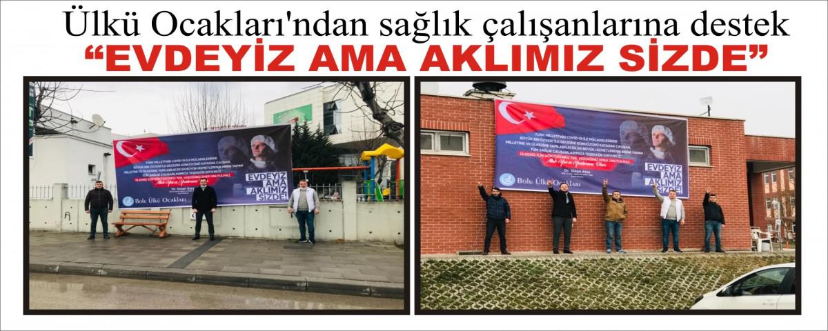 Pankartlarda Ülkü Ocakları Genel Başkanı Sinan Ateş'in sağlık çalışanlarımız hakkında verdiği mesajların da bulunduğu pankartlar İzzet Baysal Eğitim ve Araştırma Hastanesi ve Köroğlu Devlet Hastanesinin duvarlarına asıldı. Bolu Ülkü Ocakları İsmail Akgül pankartlarla ilgili olarak yaptığı açıklamada, “İlimizde ki hastanelerimizin önüne zor zamanlarda hizmet veren sağlık çalışanlarımıza “Evdeyiz Ama Aklımız Sizde” sloganıyla Ülkü Ocakları Genel Başkanımız Doç.Dr.Sinan Ateş ‘in mesajlarını içeren pankartlarımızı astık. Yüce Allah Türk Milletinin yardımcısı olsun” ifadelerini kullandı.