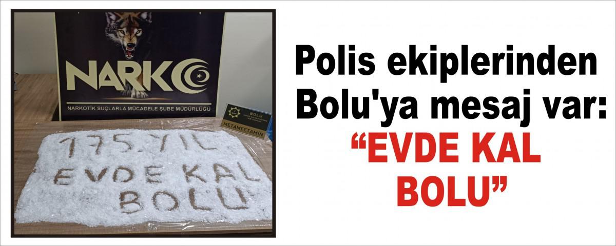 Bolu'da, düzenlenen uyuşturucu operasyonunda polis ekipleri, yakaladıkları 1 kilo 782 gram metamfetamin maddesi ile Türk Polis Teşkilatı'nın 175'inci kuruluş yıl dönümünü kutlayarak “Evde kal Bolu” yazdı.