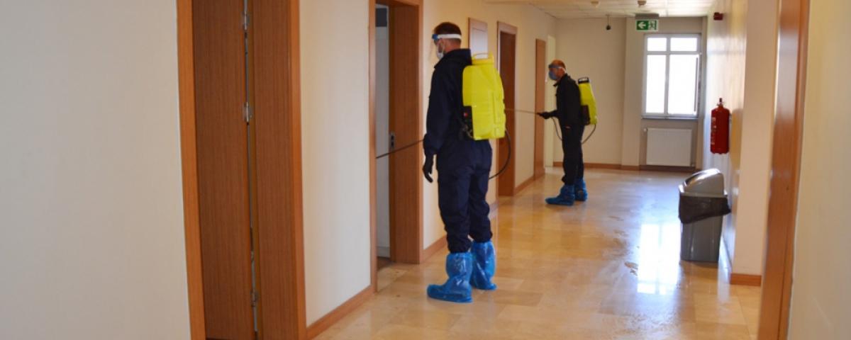 Bolu Abant İzzet Baysal Üniversitesi Eğitim ve Araştırma Hastanesi'nde görevli, koronavirüsle mücadele eden, çoğunluğu hemşirelerden oluşan 50 sağlık çalışanımızın konakladığı BAİBÜ Sosyal Tesisleri'nde kapsamlı dezenfeksiyon yapıldı. Dezenfeksiyon uygulaması olarak kullanılan ULV soğuk sisleme yöntemi, virüs ve bakterilere karşı etkinliğini yaklaşık iki hafta boyunca sürdürebiliyor. Dezenfeksiyon işlemlerinin belirli aralıklarla yapılması belirlendi. Elif Erdoğan