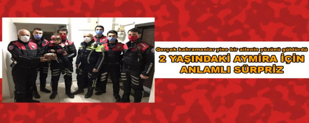 Korona virüs tedbirleri kapsamında Borazanlar mahallesi Hürriyet caddesinde yaşayan ve doğum gününü kutlayamayan 2 yaşındaki Aymira İlker'in ailesi, durumu polis ekiplerine bildirdi. Küçük kızın durumuna üzülen İl Emniyet Müdürlüğü'ne bağlı yunus ve trafik polisleri, Aymira için sürpriz yapmaya karar verdi. Hazırladıkları pasta ile küçük Aymira'nın yaşadığı eve giden polis ekipleri, küçük kız ve ailesine doğum günü sürprizi yaptı.