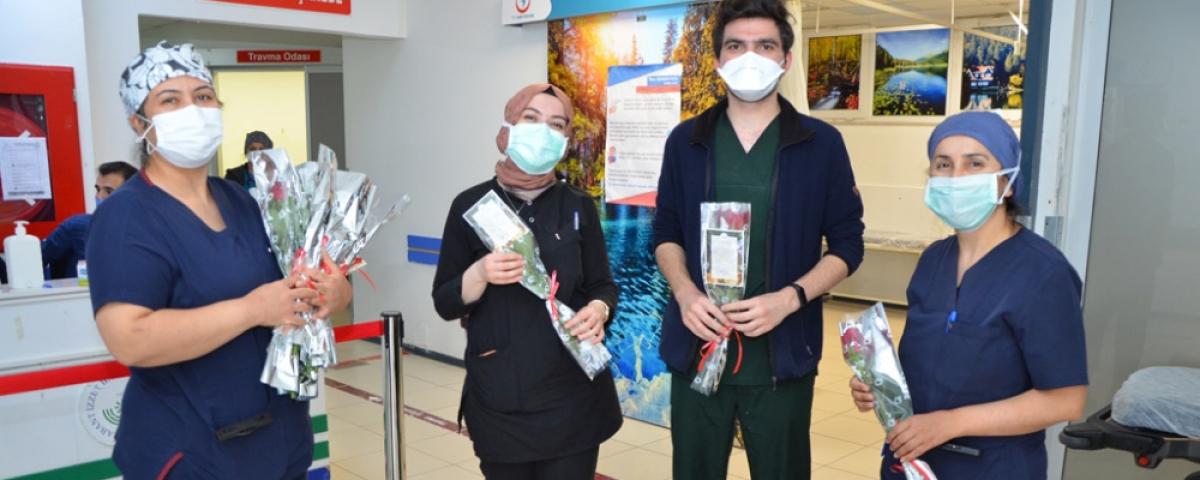 Rektör Alişarlı'nın hemşirelere tebrik mesajını içeren imzalı bir kart da güllerin yanında verildi. Alişarlı mesajında, hemşirelerin pandemi günlerinde mevcut bulunan görev yüklerinin daha arttığını, özveriyle çalışan hemşirelerimizin takdir ve övgüye fazlasıyla layık olduklarını vurguladı.
