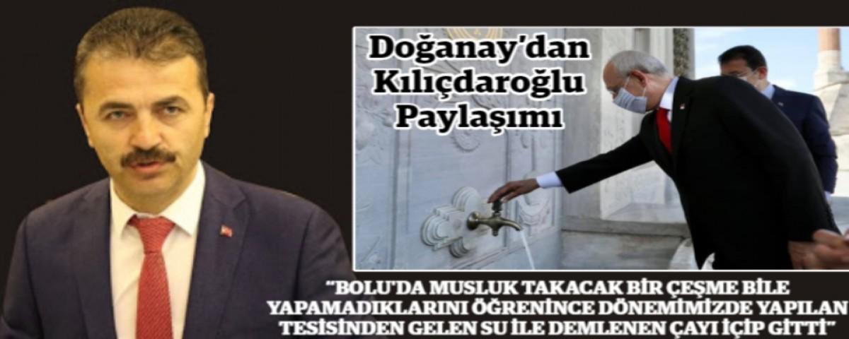 Doğanay paylaşımında, “Temel atamama ve açılış yapamama rekoru kıran CHP Genel Başkanı Sn Kemal Kılıçdaroğlu, Bolu'da musluk takacak bir çeşme bile yapamadıklarını öğrenince, dönemimizde yapılan Temiz Su Arıtma Tesisinden gelen su ile demlenen çayı içip gitti” ifadelerini kullandı.