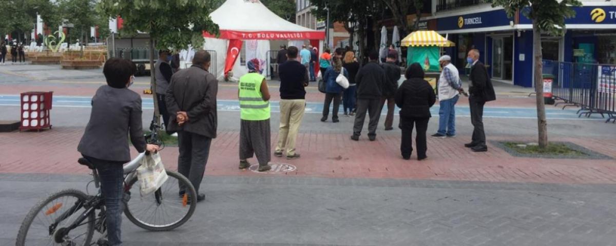 Korona virüs ile mücadele kapsamında Bolu Kızılay Şubesi'nin Kent Meydanı'nda kurduğu maske dağıtım çadırının önünde uzun kuyruklar oluştu.