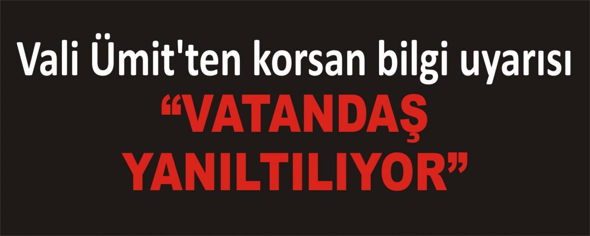 Gazetecilere korona virüs hakkında açıklama yapılan ve yayılan korsan bilgiler hakkında konuşan Vali Ümit, “Resmi kurumların dışında, bakanlarımızın yada Cumhurbaşkanımızın bizim dışımızda yapılan hiçbir açıklamaya riayet edilmemesini, itibar edilmemesini özellikle istirham ediyorum. Çünkü, bugüne kadar korsan bilgiler verildi. Sizler de, bizler de yanıltılıyoruz. Daha doğrusu vatandaş yanıltılıyor. Bu bilgilerin hiç biri doğru değil. Buradan devletimizin genel amacı şu, içinde bulunduğumuz pandemi sürecinde bu olay ne kimseyi paniğe soksun, ne de kimseyi rehavete soksun. Hem rehavetten hem de panikten kaçınılması gerekiyor. Onun için eğer kişilere bırakırsak açıklamalara bırakırsak, değişik şekillerde istismarlar yapılacak. Sağlık bakanlığımız tarafından resmi net rakamlar veriliyor” ifadelerini kullandı.