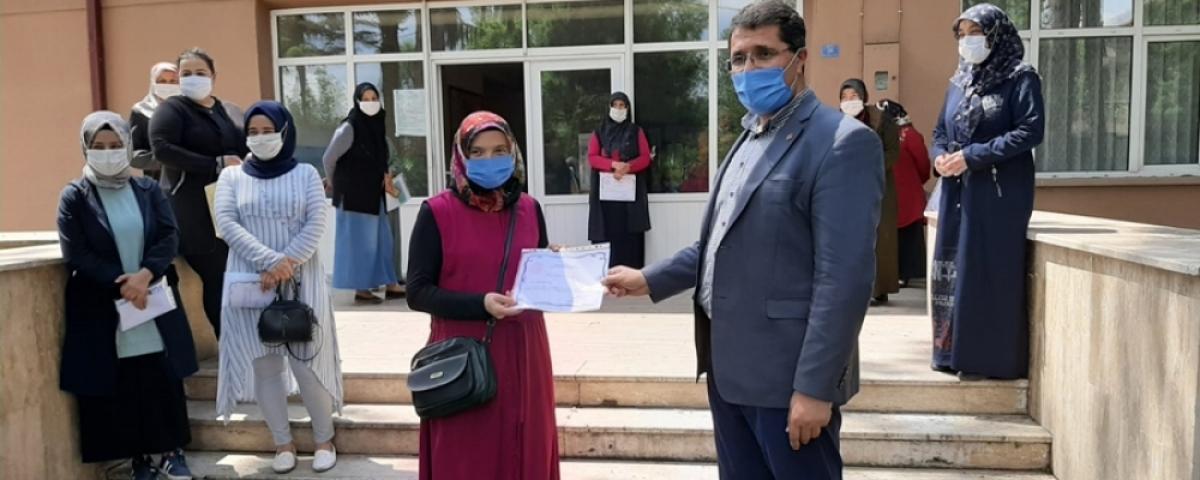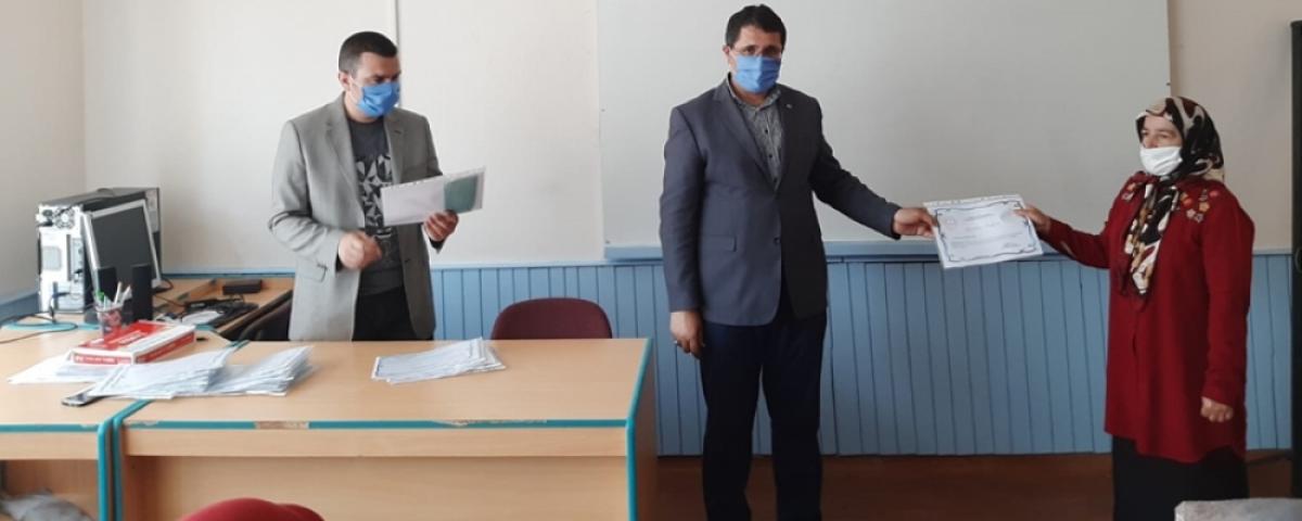 Mengen Halk Eğitim Merkezi öğretmenleri ve kursiyerleri 17 bini sağlık çalışanlarına, 5 bini ilçede yapılacak olan sınavlarda kullanılmak üzere İlçe Milli Eğitim Müdürlüğüne olmak üzere 22 bin maske dikerek sürece destek oldu. Mengen İlçe Milli Eğitim Müdürü Salih Celepci bu desteği karşılıksız bırakmayarak, Mengen Halk Eğitim Merkezi kurum binasında düzenlenen törende, maske dikimi yapan kursiyerlere teşekkür belgesi verdi.