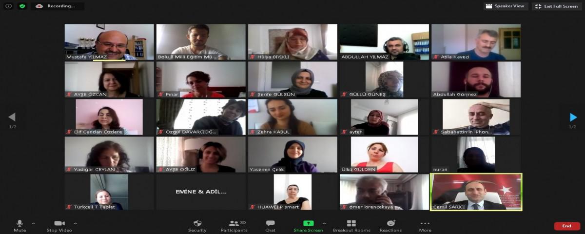 Bolu İl Milli Eğitim Müdürü Cemil Sarıcı, Online Mesleki Çalışmanın ilk gününde il merkezinde Orhangazi Ortaokulu, 100. Yıl İlkokulu, Bolu Fen Lisesi, Bolu Sosyal Bilimler Lisesi, Bolu İmam Hatip Lisesi ve Hacı Bayram Veli İmam Hatip Ortaokulu'na bağlanarak öğretmenler ve okul idarecileri ile 2019-2020 Eğitim Öğretim Dönemini değerlendirdi. Korona virüs salgını esnasında fedakârca uzaktan eğitim faaliyetleri ve Vefa Destek Gruplarında çalışan öğretmen ve idarecilerimize teşekkürlerini ileten Müdür Sarıcı, yaz tatilinin öğretmenlerimize hayırlı olmasını diledi. Salgın tedbirlerine uyarak herkesin sağlıklı bir şekilde yaz tatilini geçirmesi dileğini iletti.