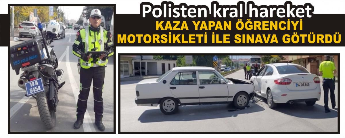 Kaza sonrası otomobil kullanılamaz hale gelirken bölgede bulunan motosikletli polis Ercan Bayraktar durumu farkedince büyük panik halindeki kız öğrenciyi hemen polis motosikletine bindirerek sınava 5 dakika kala okula yetiştirmeyi başardı.