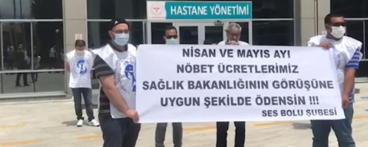Sağlık ve Sosyal Hizmet Emekçileri Sendikası (SES) Bolu Şube Başkanı Serdar Koçyiğit tarafından yapılan açıklamada, “Dünyayı ve ülkemizi etkisi altına alan Covid-19 salgmı birçok alanda sıkıntılar oluşturmuş bir Halk Sağlığı sorunudur. Bu dönemde okullar kapanmış, birçok meslek grubu çalışmamış esnek çalışmış, birçok işyeri salgın nedeniyle kapalı tutulmuş; ancak sağlık emekçilerinin yıllık izni, kronik hasta izinleri ücretsiz izni hatta emeklilik hakkı bile ertelenerek verilmemiştir. Sağlık emekçileri sürekli virüs bulaş riski ile 7/24 çalışmak zorunda kalmıştır. Sadece kendileri değil aileleri çocukları da süreçten oldukça fazla mağdur olmuş, katmerli bir şekilde toplumsal izolasyona ve desteksiz yaşam sürdürmeye mahkûm edilmiştir. Küçük çocuklarını evde yalnız bırakarak aylarca sevdiklerini görmeden ve sevdiklerini virüsten korumak için aşırı stres altında yaşamlarını sürdürmeye çalışmışlar koruyucu ekipman için de saatlerce kalarak her kazandığı ücreti fazlasıyla hak etmişken maalesef bu zor şartlar altında Nisan ve Mayıs aylarında tutulan nöbet ücretleri eksik ödenmiştir. Sağlık Bakanlığı Hukuk Hizmetleri Genel Müdürlüğü'nün 30.04.2020 tarihli görüş yazısının 1.maddesinde Covid-19 salgını nedeniyle, Cumhurbaşkanlığı'nın 22 Mart genelgesi ve Sağlık Bakanlığının 23 Mart genelgesi hatırlatılarak esnek çalışma yolu ile idari izin verilen çalışanların mesai dışı çalıştırılması halinde; çalıştırıldığı süreden idari izin düşürülemeyeceğini ve bu şekilde fazla çalıştırıldığı nöbet süresinin izinle karşılanmıyorsa para karşılığı ödeneceği belirtilmiştir”