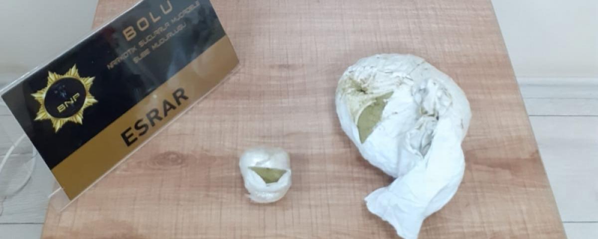 Edinilen bilgiye göre, İl Emniyet Müdürlüğü Narkotik Suçlarla Mücadele Şube Müdürlüğü ekipleri Anadolu Otoyolu'nun Bolu kesiminde Doğu illerinden batı illerine uyuşturucu madde sevkiyatı yapıldığı yönünde istihbarat aldı. Gelen bilgileri değerlendiren polis ekipleri, Anadolu Otoyolu'nun Bolu kesiminde ihbar edilen aracı durdurarak arama yaptı. Durdurulan araç içersin de yapılan aramada kıyafetlerin içerisine saklanmış 2 parça halinde toplam daralı ağırlığı 1kilo 272 gram Toz Esrar maddesi ele geçirildi.
