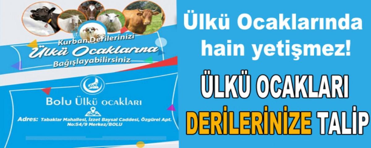 Bolu Ülkü Ocakları Başkanı İsmail Akgül, kurban kesecek vatandaşlardan derilerini kendilerine bağışlamalarını istedi. Kendilerine verilecek derilerden elde edilecek gelirin Bolu'da barınmalarına yardımcı olunan ve ihtiyaçları karşılanan üniversite öğrencileri için kullanılacağını belirten Akgül, “Ülkü Ocakları Eğitim ve Kültür Vakfı olarak kurulduğu günden bu yana maksadı, ülküsü sadece Türk Gençliğine Kılavuz olabilmek, başta ailesi olmak üzere; üzerinde yaşadığı toprağına ve milletine sahip çıkmak adına mücadele etmiş ve etmeye de devam etmektedir. Yaptığı Sosyal Çalışmalar ile örnek teşkil eden ve tüm kesimin takdirini toplayan Ülkücü Türk Gençliğine sahip çıkabilmek adına desteklerinizi bekliyoruz. Vatandaşlarımız emin olsunlar; Ülkü Ocakları'ndan haydut çıkmaz, hain çıkmaz! Bizler burada her şeyden önce vatanını ve bayrağını seven, ahlaklı bir gençlik yetişmesi için çaba gösteriyoruz” ifadelerini kullandı.