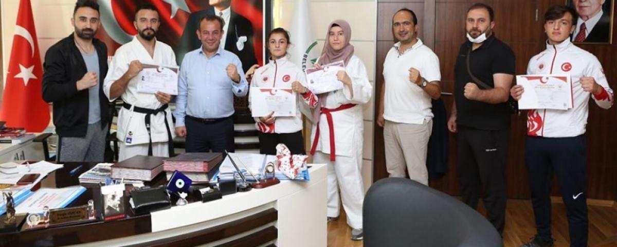 Bolu Belediyespor Kulübü bünyesinde elde ettikleri başarılarla kendi branşlarında milli takımlara yükselen genç sporcular, Gençlik ve Spor İl Müdürü Çilkara'nın ardından Bolu Belediye Başkanı Tanju Özcan'ı makamında ziyaret etti.