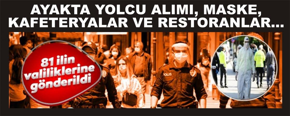 Ülke genelinde tüm alanlarda vatandaşlara istisnasız maske takma zorunluluğu getirildi. Minibüs ve midibüsler ile koltuk kapasitelerinde herhangi bir seyreltme ve kaldırılma yapılmayan otobüsler gibi iç hacim bakımından fiziki mesafe kurallarının uygulanamayacağı şehir içi toplu ulaşım araçlarında ayakta yolcu alınmasına kesinlikle müsaade edilmeyecek. Bunların dışında kalan raylı sistem araçları, metrobüsler ve koltuk kapasiteleri seyreltilmiş otobüsler gibi ayakta yolcu taşıma ağırlıklı toplu ulaşım araçlarında, fiziki mesafe kurallarına aykırı olmayacak şekilde hangi sayıda ayakta yolcu alınabileceği il ve ilçe umumi hıfzıssıhha kurulları tarafından tespit edilecek. Raylı sistem araçları, metrobüsler ve koltuk kapasiteleri seyreltilmiş otobüslerde ayakta alınabilecek yolcu sayısını belirtir levha herkesin görebileceği şekilde asılacak ve ayaktaki yolcuların durabileceği yerler fiziki olarak işaretlenmek suretiyle ilanı sağlanacak.